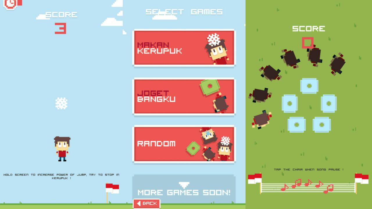 Di game ini kamu akan menemukan permainan yang biasanya diperlombakan di hari perayaan kemerdekaan Indonesia, seperti tarik tambang, balap karung, panjat pinang, dan memasukkan paku dalam botol.