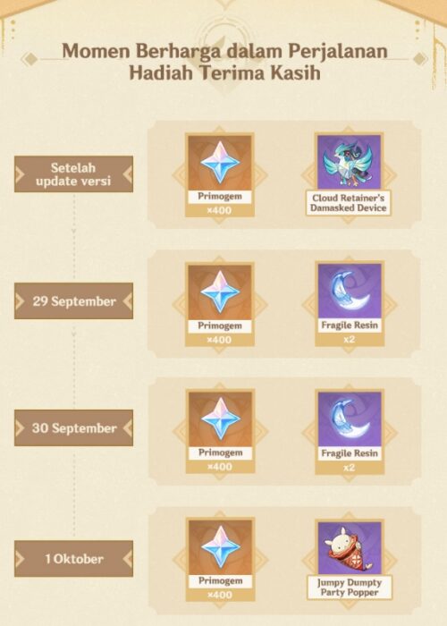 Untuk hadiah secara In-Game Mail, pemain akan mendapatkan 1.600 Primogems, 4x Fragile Resin, Jumpty Dumpty Party Pooper, dan Cloud Retainer’s Damasked Device.