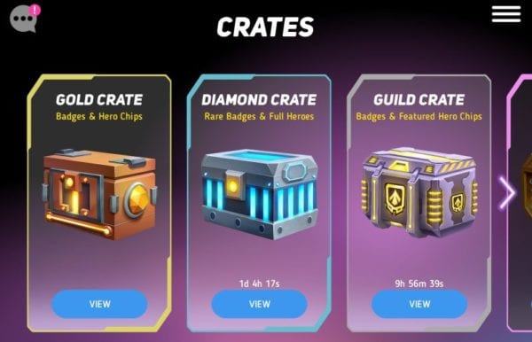 Ada 4 macam peti di dalam game ini, seperti Gold Crate, Diamond Crate, Guild Crate, VIP Crate. Masing-masing peti terdapat hero atau setidaknya hero chip. Kamu bisa mendapatkan secara gratis dan juga ada yang bayar. Jika kamu membayar lebih tinggi apalagi menggunakan diamond, kamu dijamin mendapat hero ditambah chip hero lainnya.