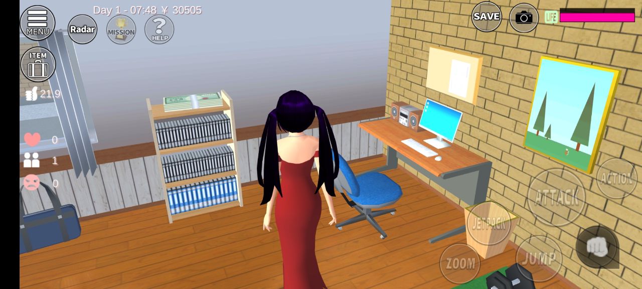 - Di Yakuza office Himawari. Untuk bisa masuk ke dalam ruangan di Yakuza office Himawari, kamu harus mengubah setting terlebih dahulu, pergi ke Sytem Setting > Police OFF, Car OFF, Clerk OFF, dan Enemy OFF. Kemudian cari uang di dalam ruangan Yakuza office Himawari, kamu akan menemukan uang di salah satu ruangan dan selain love potion, kamu juga akan menemukan berbagai senjata di sana.