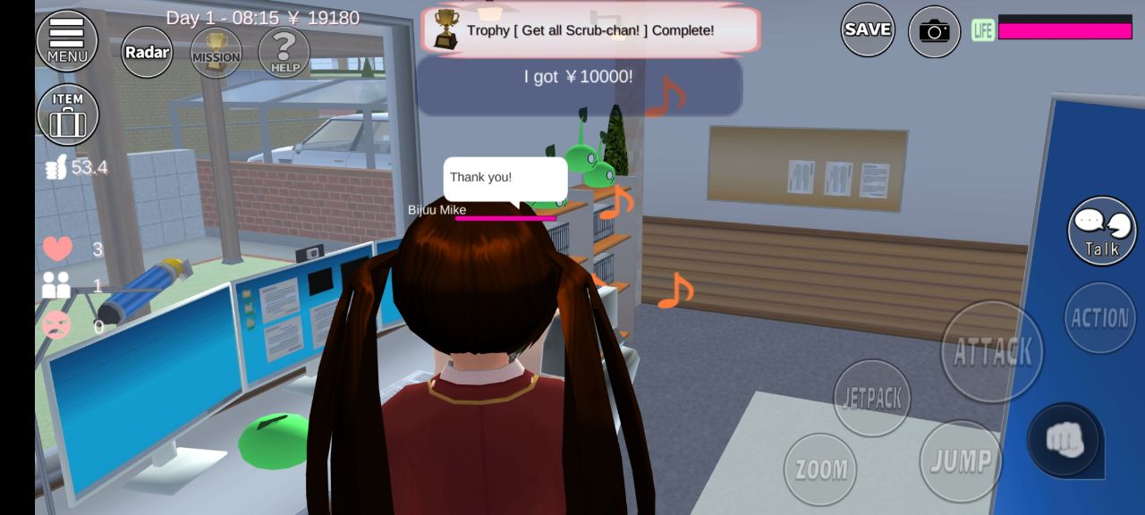 - Pergi ke Cafe dan kamu akan melihat di depan cafe ada sebuah rumah, kunjungi rumah tersebut yang dihuni oleh cowok bernama Bijuu Mike, selesaikan misi yang diberikannya dan setelah misi selesai, kamu akan mendapatkan uang darinya.