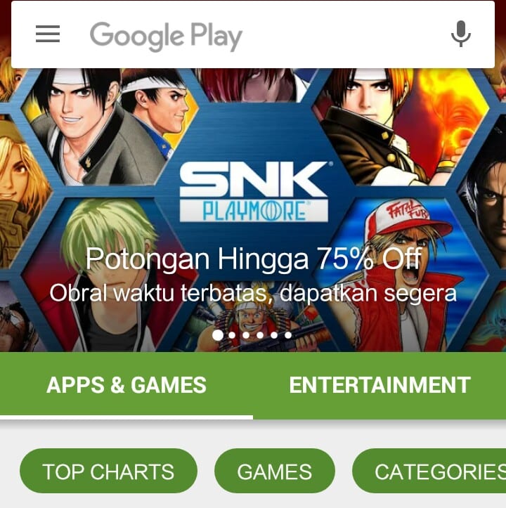 Buat para pecinta game besutan SNK, sekarang waktunya yang tepat untuk memiliki game-game SNK yang keren melalui google playstore! karena lagi ada diskon hingga 75% dalam waktu yang terbatas.