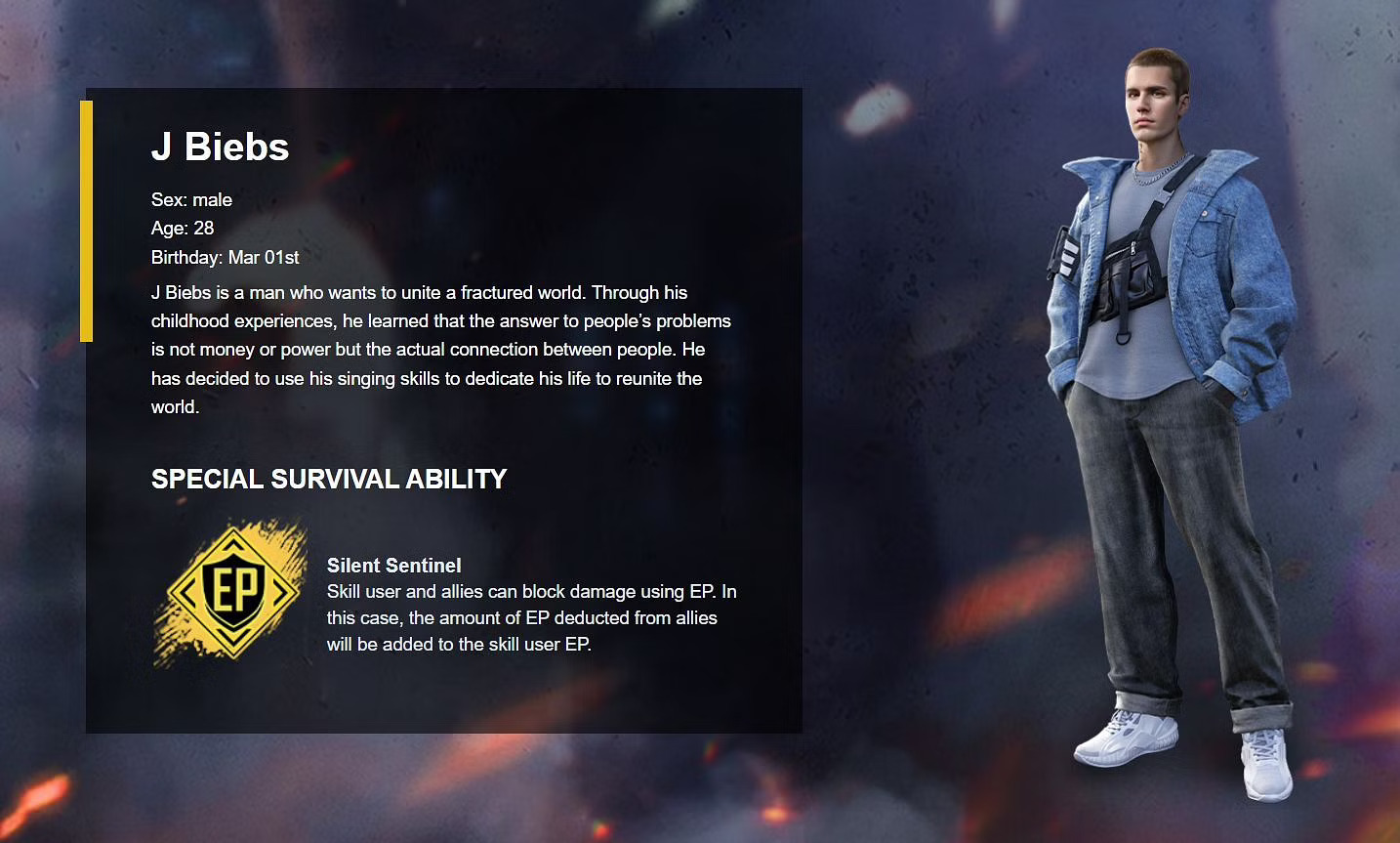 Karakter Justin Bieber yang akan hadir dalam kolaborasi ini akan dilengkapi dengan kekuatan unik. Justin Bieber di Free Fire, J Biebs, nantinya akan miliki kemampuan untuk block damage dengan menghabiskan sejumlah EP.