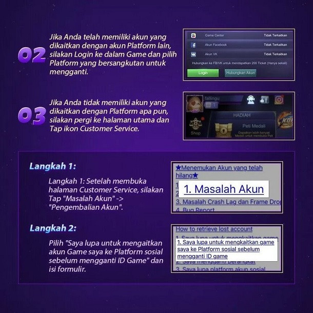 Jika kamu sudah memiliki akun yang telah dikaitkan dengan platform lain, kamu cukup hanya melakukan login dalam game dan pilih platform yang bersangkutan untuk mengganti. Tapi, jika kamu belum mengaitkan ke platform apa pun, kembali ke beranda dan tap ikon Customer Service untuk memproses pemulihan akun.