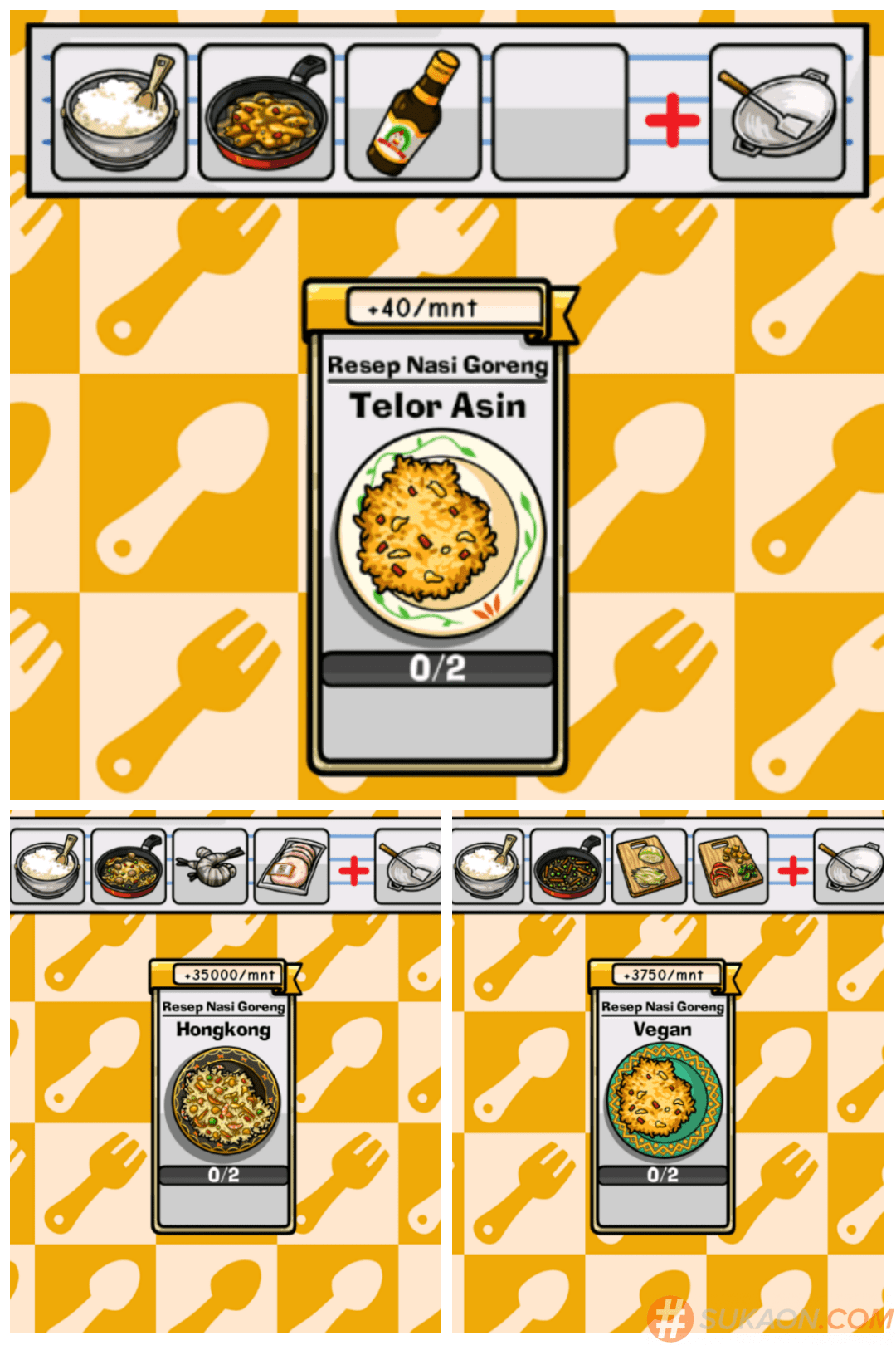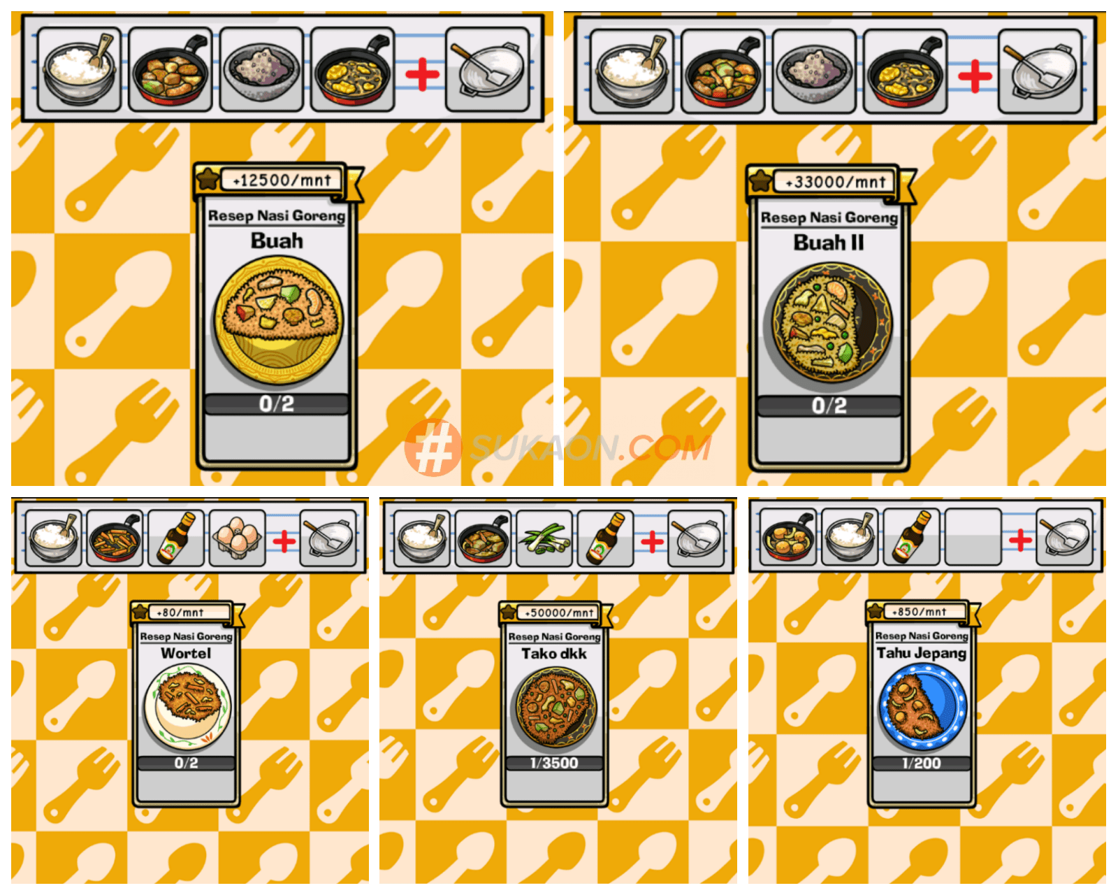 Kamu mungkin akan mengalami kesulitan untuk menemukan resep di game Nasi Goreng ini karena kamu harus menerka apa saja bahan dan cara memasaknya. Nah, Kali ini Sukaon akan memberikan bocoran mengenai resep nasi goreng yang ada di game Nasi Goreng, berikut kumpulan resepnya.