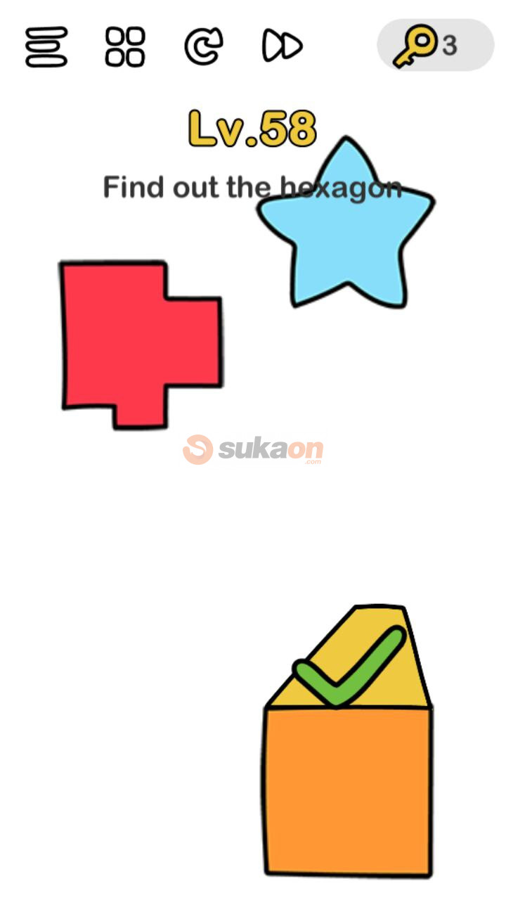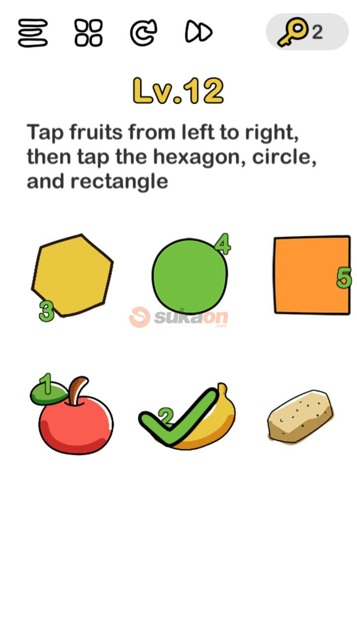 A: Ketuk semua buah (mulai dari kiri ke kanan) di layar sesuai perintah, lalu ketuk segi enam dan kemudian ketuk sebanyak 2 kali pada belah ketupat warna orange.