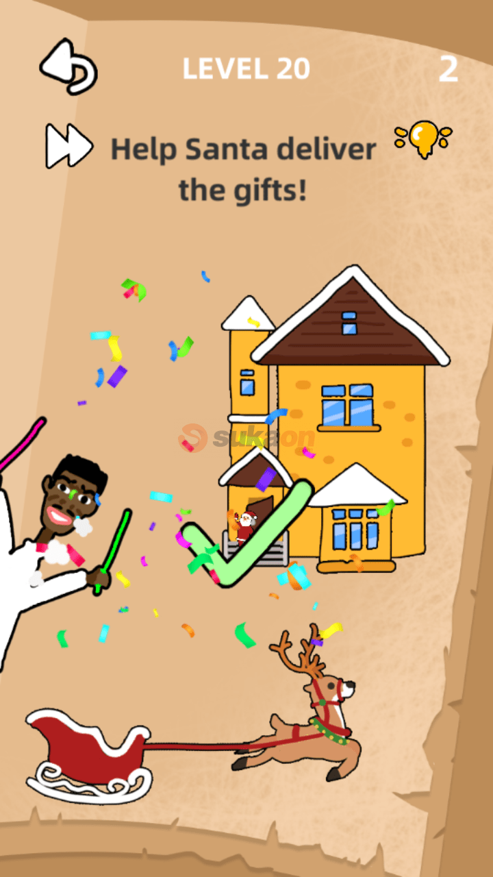 A: Geser tanda berhenti keluar layar untuk menyingkirkan kawat-kawat itu, dan kemudian geser Santa ke pintu rumah.
