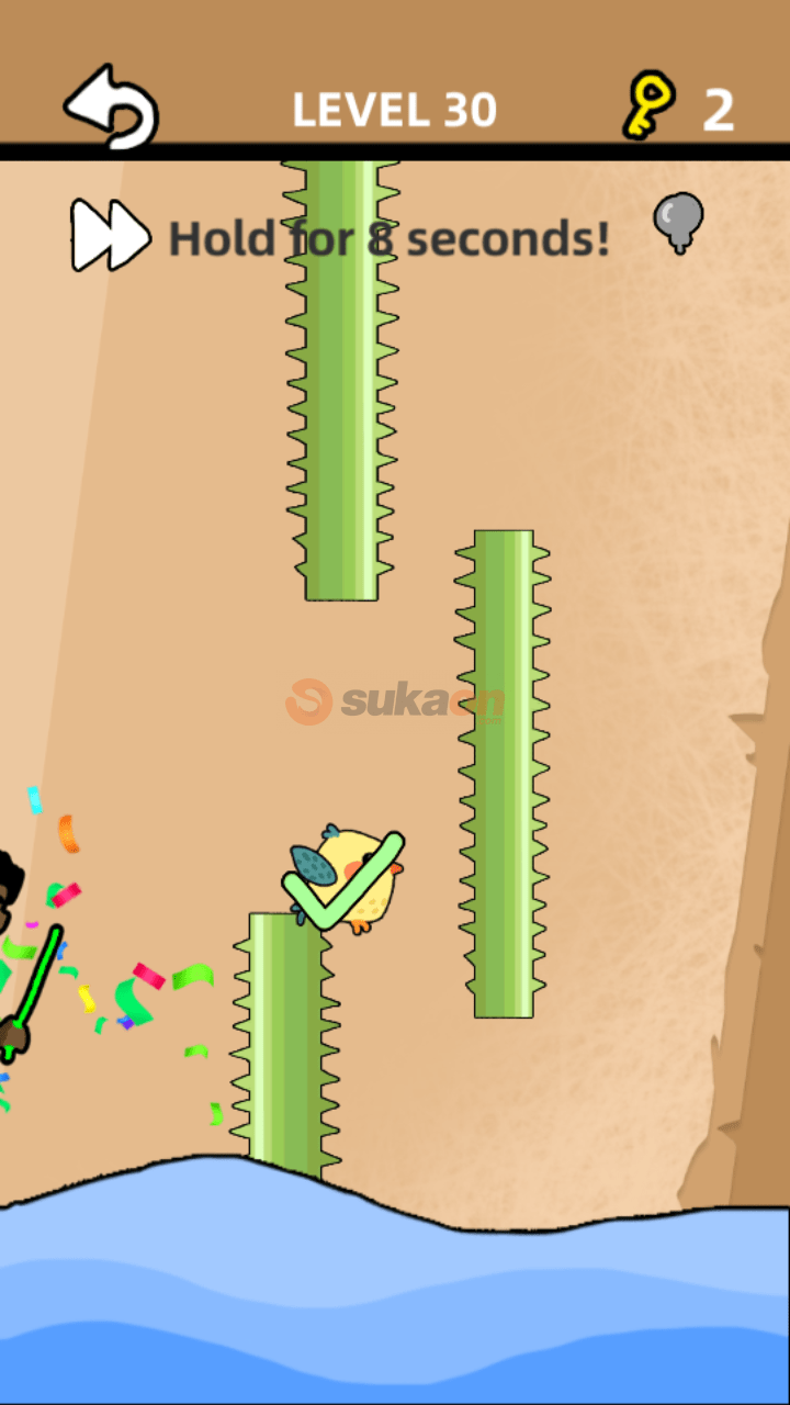 A: Kamu tidak perlu melewati jebakan berduri, kamu hanya perlu menjatuhkan burung tersebut ke perahu dan tunggu sampai waktu selesai.