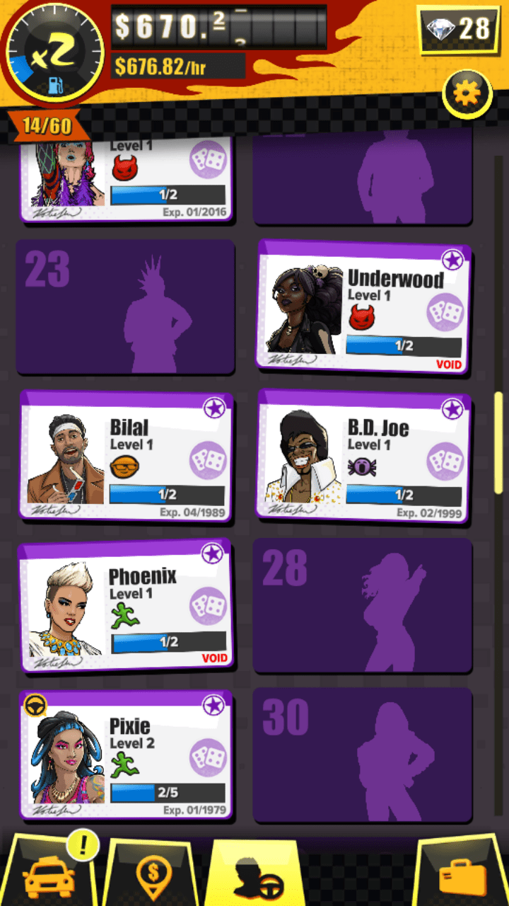 Supir taxi ini memiliki taxi favorit, apabila kamu meletakkan mereka ke taxi yang cocok dengan kriteria mereka, mereka akan lebih banyak menghasilkan ketimbang supir yang tidak ditempatkan di taxi yang mereka sukai. Hal ini memang cukup sulit dilakukan terutama saat di awal permainan karena supir yang dimiliki terbatas, namun setelah beberapa lama bermain, kamu akan mendapatkan banyak pilihan supir yang bisa kamu tempatkan ke taxi yang mereka sukai.