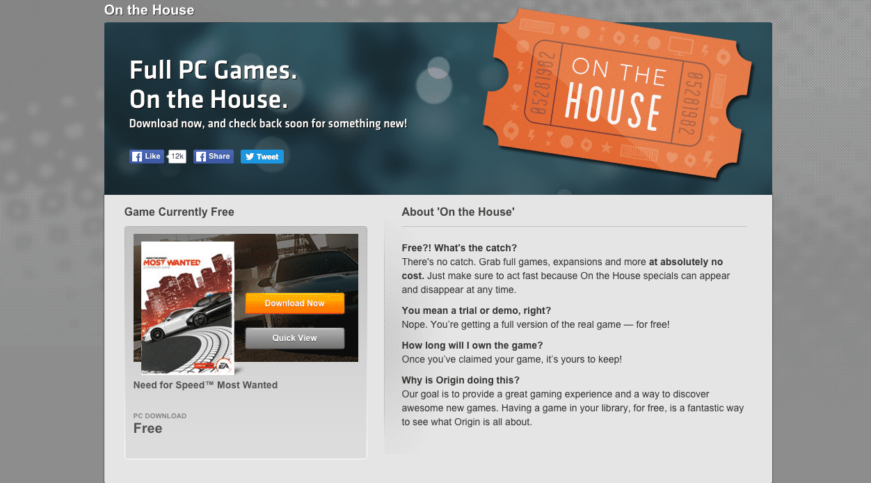Melalui Origin untuk program On the House yang mereka sering adakan di berbagai kesempatan. Tidak diketahui secara pasti sampai kapan program On the House untuk Need For Speed Most Wanted ini berakhir. So, tunggu apalagi? download game Need For Speed Most Wanted secepatnya disini