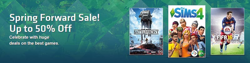 Origin kembali mengadakan Spring Sale tahun ini. Origin memberikan diskon besar-besaran ini hingga 11 april 2016. Beberapa game EA (Electronic Arts) populer yang mendapat diskon seperti The Sims 4, FIFA 16, Star Wars BattleFront dan yang lainnya bisa kamu dapatkan dengan potongan harga hingga 50%.