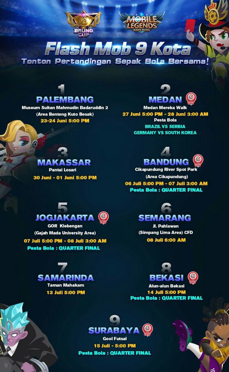 Tak kalah seru, penggemar Mobile Legends: Bang Bang mengadakan kegiatan Flash Mob di berbagai kota di Indonesia yang akan dimulai pada 23 Juni 2018 ini. Berawal dari Palembang, flash mob akan diselenggarakan di 9 (Sembilan) kota berbeda dimana beberapa lokasi akan menyiarkan langsung Piala Dunia untuk mengundang lebih banyak orang merasakan sensasi sepakbola dan Mobile Legends! Diyakini acara ini akan mengundang perhatian jutaan fans Mobile Legends karena didukung pula dengan pembagian kaos official “Mobile Legends – football limited edition” dan gantungan kunci.