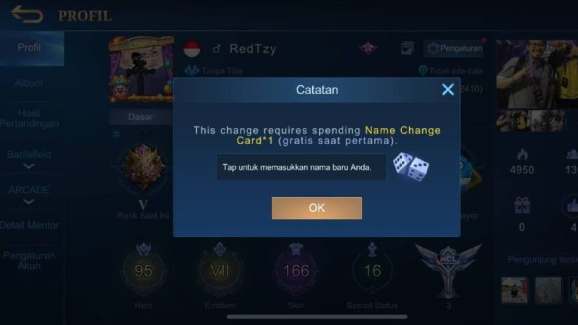 Namun, seiring waktu tidak sedikit para pemain yang merasa bosan dengan nama yang di milikinya dan ingin menggantinya dengan nama yang baru. Para pemain sebenarnya di fasilitasi untuk bisa mengganti nama atau nickname Mobile Legends. Namun, untuk mengganti nama nickname di dalam Mobile Legends, Anda harus mempunyai Name Change Card atau bayar.