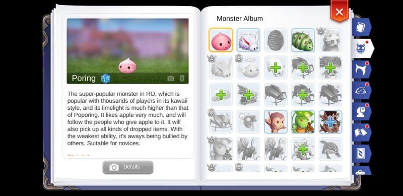 Salah satu fitur baru di Ragnarok M: Eternal Love adalah Adventure Handbook yang berfungsi sebagai buku harian tentang banyak hal yang berkaitan dengan petualanganmu. Setiap monster dan NPC yang kamu temui, serta headwear, pet, dan achievement yang kamu dapatkan tercatat di sini. Saat kamu mencapai progres baru, kamu bisa menambahkan beberapa di sini secara manual dengan mengklik tanda “+”. Kemudian kamu akan mendapatkan adventure experience dan terkadang koin Eden juga.