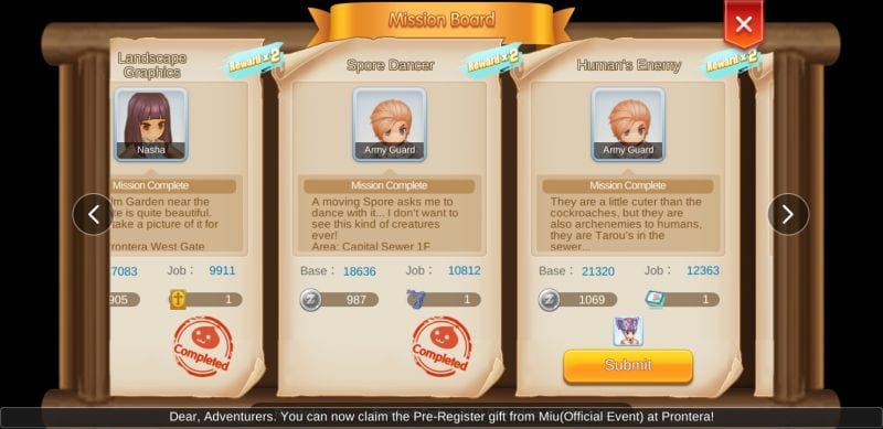 Setelah kamu menyelesaikan satu quest, pastikan untuk kembali ke Mission Board manapun untuk mendapatkan reward serta untuk mengambil misi berikutnya. Pastikan untuk mencatat di mana sebagian besar misi akan berlangsung dan ingat untuk simpan di Kafra station dekat dengan tempat yang sebagian besar quest akan terjadi untuk menghemat waktu perjalananmu.