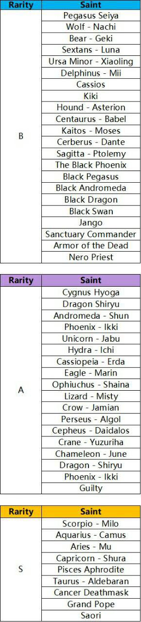 Berikut daftar karakter yang ada di Saint Seiya: Awakening beserta tingkat rarity / kelangkaannya.