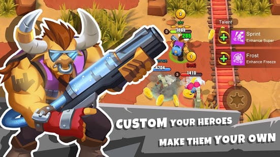 Terkadang kamu akan melihat ikon kecil berwarna yang melayang disekitar medan perang. Itu adalah power up sementara yang menambah statistik hero kamu. Ikon biru akan meningkatkan kecepatan gerakmu, sementara pistol merah akan meningkatkan kekuatan seranganmu, dan ikon plus berwarna hijau akan memulihkan kesehatanmu.