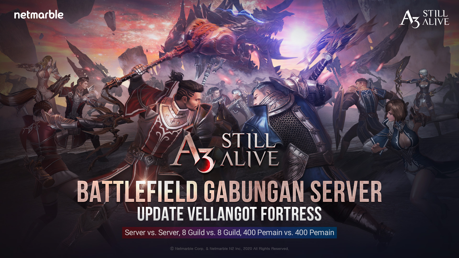 Battle lintas server Vellangot Fortress mulai dibuka untuk para pemain setiap Kamis. Dua dari server A3: STILL ALIVE akan bersaing melawan satu sama lain, dengan 8 Guild teratas dari masing-masing server bertarung memperebutkan kemenangan. Dengan kapasitas maksimum 800 pemain yang dapat bergabung dalam battle, setiap pemain di server pemenang akan menerima reward spesial serta World Buff meski mereka tidak berpartisipasi dalam battle server.